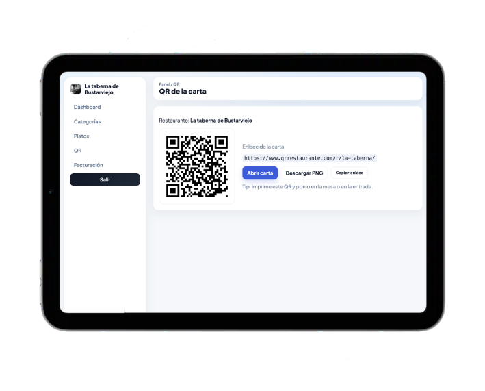 Ideal para equipos que necesitan agilidad: cambias un plato en el panel y el cliente lo ve al instante al escanear el QR.