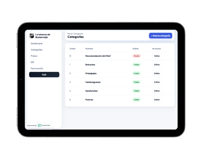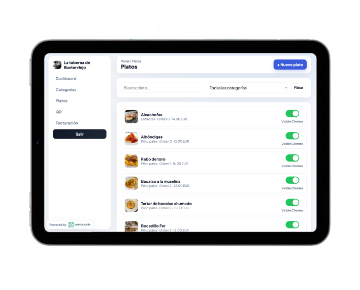 - Control de disponibilidad y visibilidad por plato y categoría.