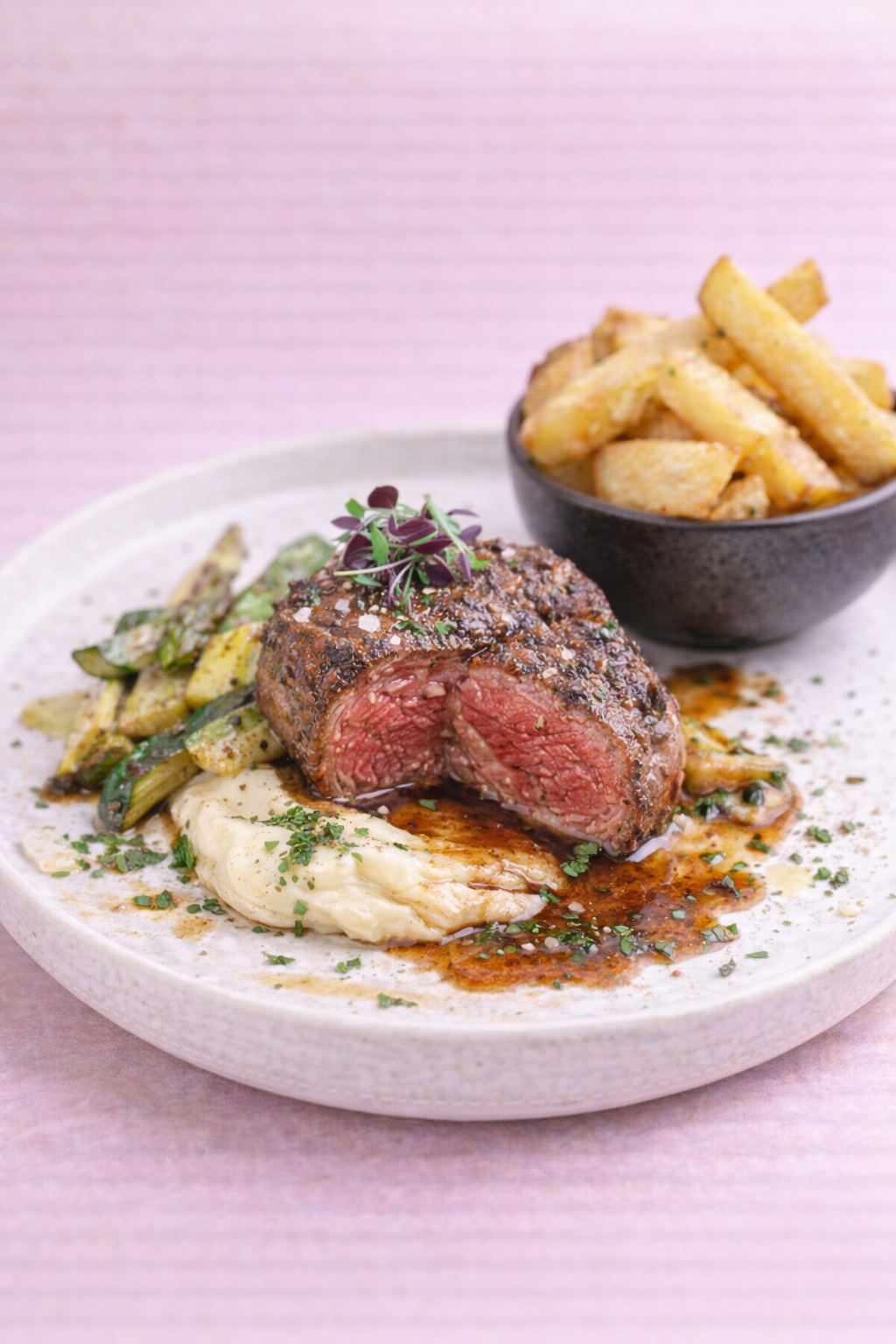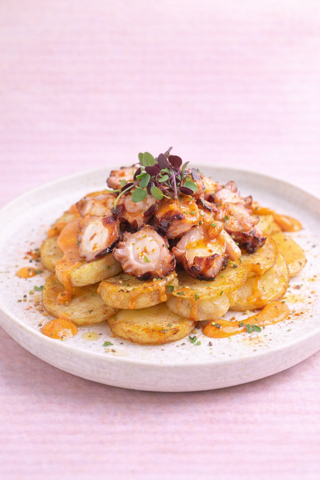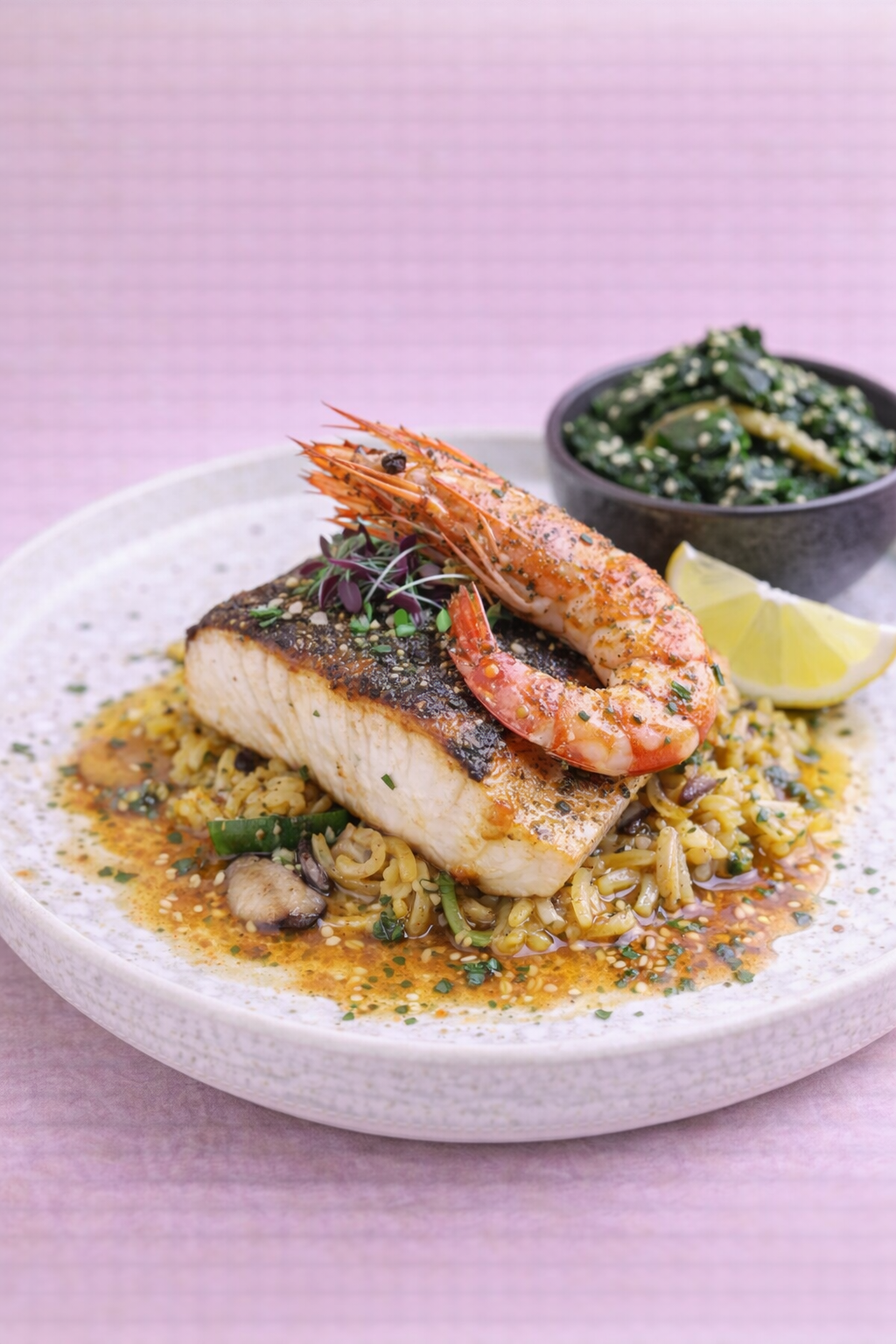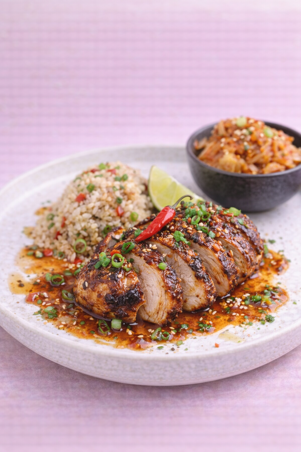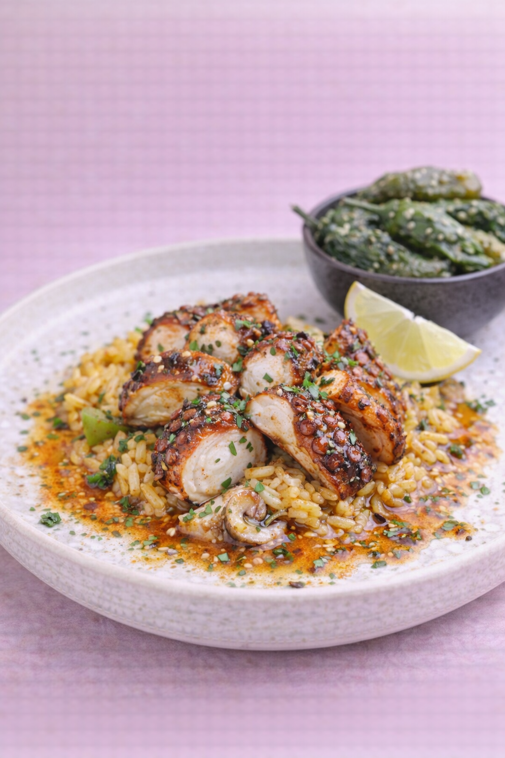 Bol de arroz jazmín con tofu crujiente marinado, garbanzos especiados al horno, boniato asado, brócoli al vapor, pepino, col morada y aguacate. Terminado con sésamo tostado, cilantro y un aliño cítrico de limón y jengibre.