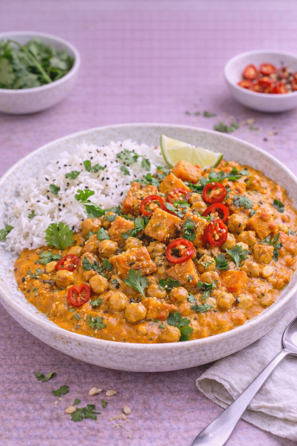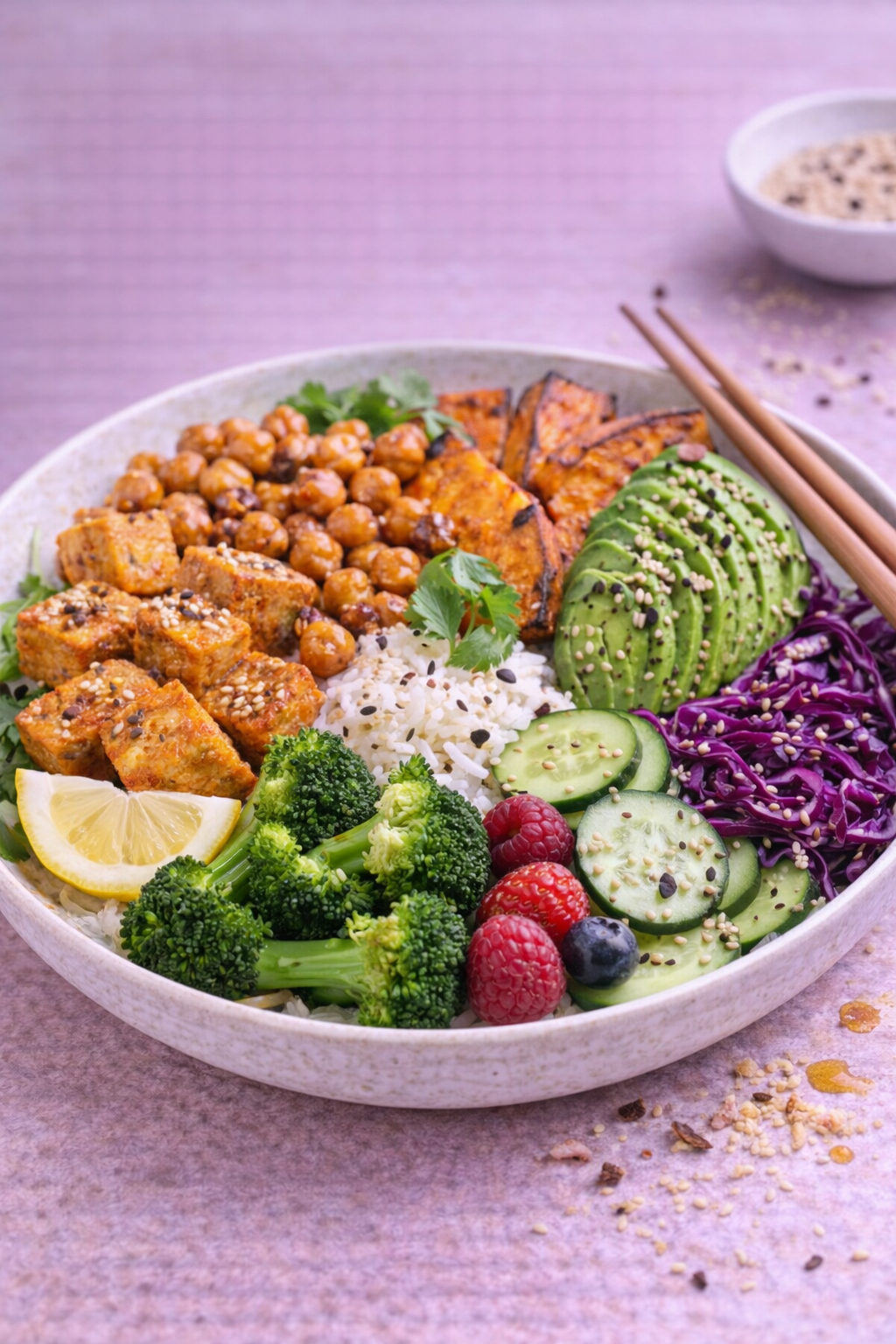 Buddha Bowl de Tofu Crujiente, Garbanzos Especiados y Aguacate